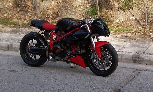 Well i will make some comments having the pic bellow as a reference point. All in all it is a great bike. It is a stunning looker. It has that aggresive forward stance, it has all those lines to visually explore, it has a great color combination, red/silver/black. And since i'm always honest, it affects one person's love and that is not me, but the bike's owner. He believed so much in this project and he did it. He made a bike that is absolutelly astonishing. His irritating undecisiveness and my Tibetan patience, gave this unique Street-Fighter. Well done man, well done.